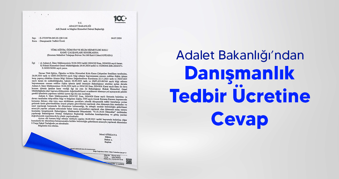 Mahkeme kararı ile dava konusu işlemin iptaline karar verilmesi sonucu, Adalet Bakanlığı Adli Destek ve Mağdur Hizmetleri Dairesi Başkanlığı tarafından sendikamıza gönderilen yazıda, ilamda belirtilen, talep edilen bilgi ve belgelere ilişkin; danışmanlık tedbir kararlarını yerine getirmek üzere görevlendirilen sosyal çalışma görevlilerine yapılacak olan ödemenin kim tarafından ve nasıl yapılacağı hususunda bir düzenlemenin bulunmadığı, bu sebeple belirsizliğin giderilmesi amacıyla yapılan çalışma neticesinde, yapılacak olan ödemenin maaş unsuru üzerinden hesaplanarak Bakanlığın Mahkemeler Bütçesinden “01.01.30.01 Ödenekler” tertibinden yapılacağının Bakanlığın Strateji Geliştirme Başkanlığı tarafından kararlaştırıldığı ve görüş yazıları doğrultusunda uygulamada da bu yönde yapıldığı; ayrıca talep edilen diğer bilgi ve belgelere ilişkin bir düzenleme bulunmamakla birlikte belirsizliğin giderilmesi amacıyla yapılacak düzenlemenin 9. Yargı Paketi Taslağında yer aldığı, ifade edilmiştir.