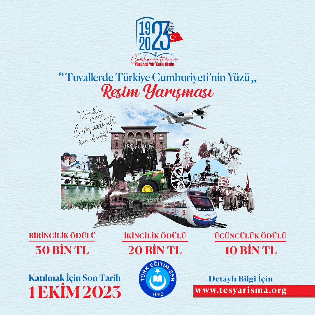 Türk Eğitim Sen Genel Merkezi tarafından Cumhuriyetimizin 100. Yılı anısına düzenlenen “Dizelerde Türkiye Cumhuriyeti’nin Yüzü” şiir yarışması ve “Tuvallerde Türkiye Cumhuriyeti’nin Yüzü” Resim yarışması 1 Ekim 2023 tarihine kadar devam ediyor. Katılım ve detaylı bilgi için tesyarisma.org web sayfamızı ziyaret edebilirsiniz.