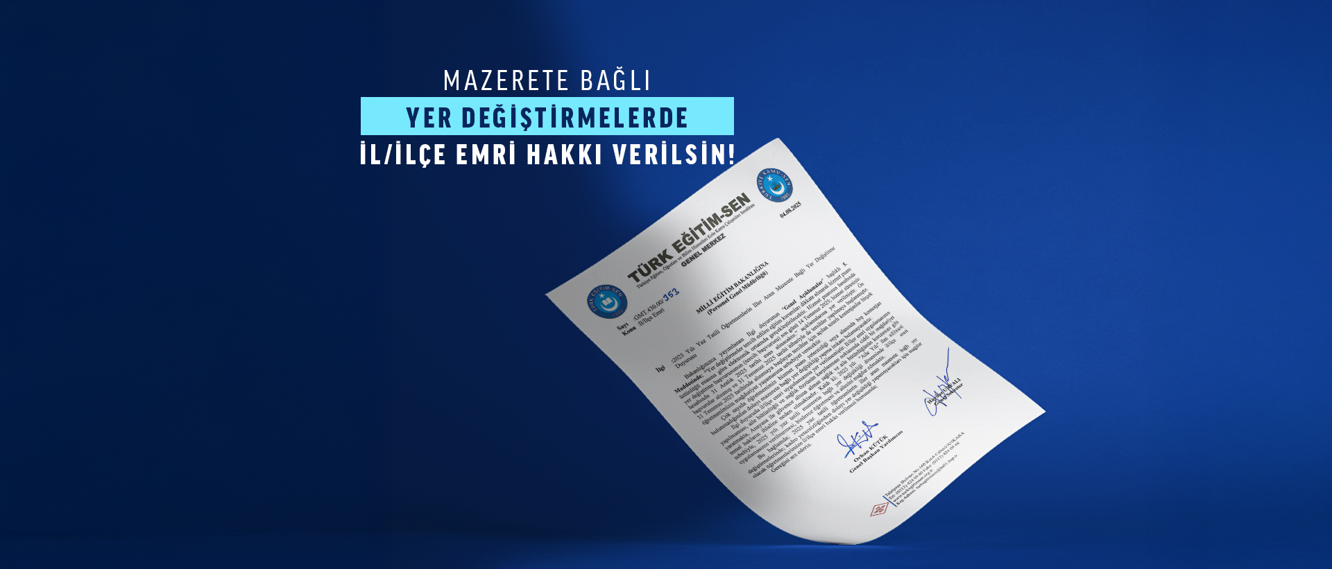 Bu bağlamda; Türk Eğitim Sen olarak 2025 yaz tatili öğretmenlerin iller arası mazerete bağlı yer değiştirmelerinde; kadro yetersizliğinden dolayı yer değişikliği yapamayacakları için mağdur olacak öğretmenlerimize il/ilçe emri hakkı verilmesi hususunda MEB’e yazılı talepte bulunduk.